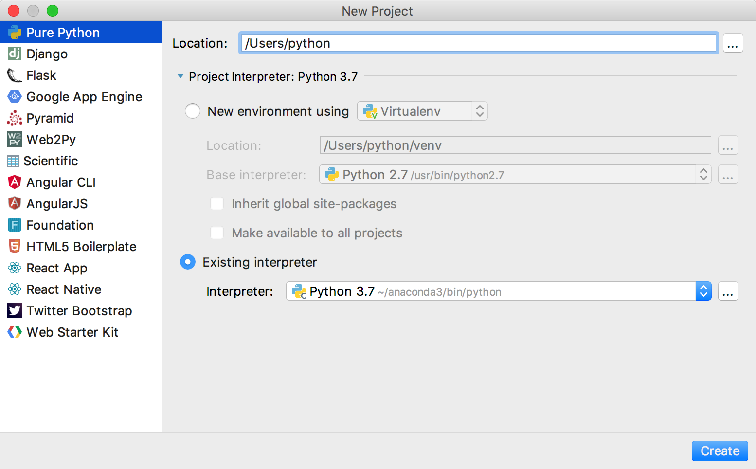 安装好之后,我们使用PyCharm新建项目的时候就可以选择anaconda3的解释器,如图: