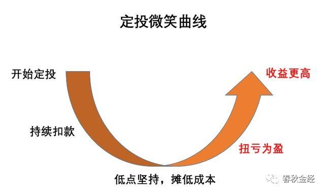 可能有很多朋友存在这样一个误区:就是在先跌后涨的行情中,我们持续定投,需要等到价格涨回定投开始时候的价格之上才能开始盈利。其实不是这样的!这是完全错误的,我们可以试想这样一个场景,价格分别从100 - 50 - 200 - 100,如果是开始时全仓买入,最后全仓卖出,获利是0;如果我们定投,会分别买入1份、2份、0.5份、1份,最后我们会用400元持有4.5份,这时候卖出,获利50元。这就是定投会自动高点少买、低点多买,只要长期定投,终会遇到微笑曲线。
