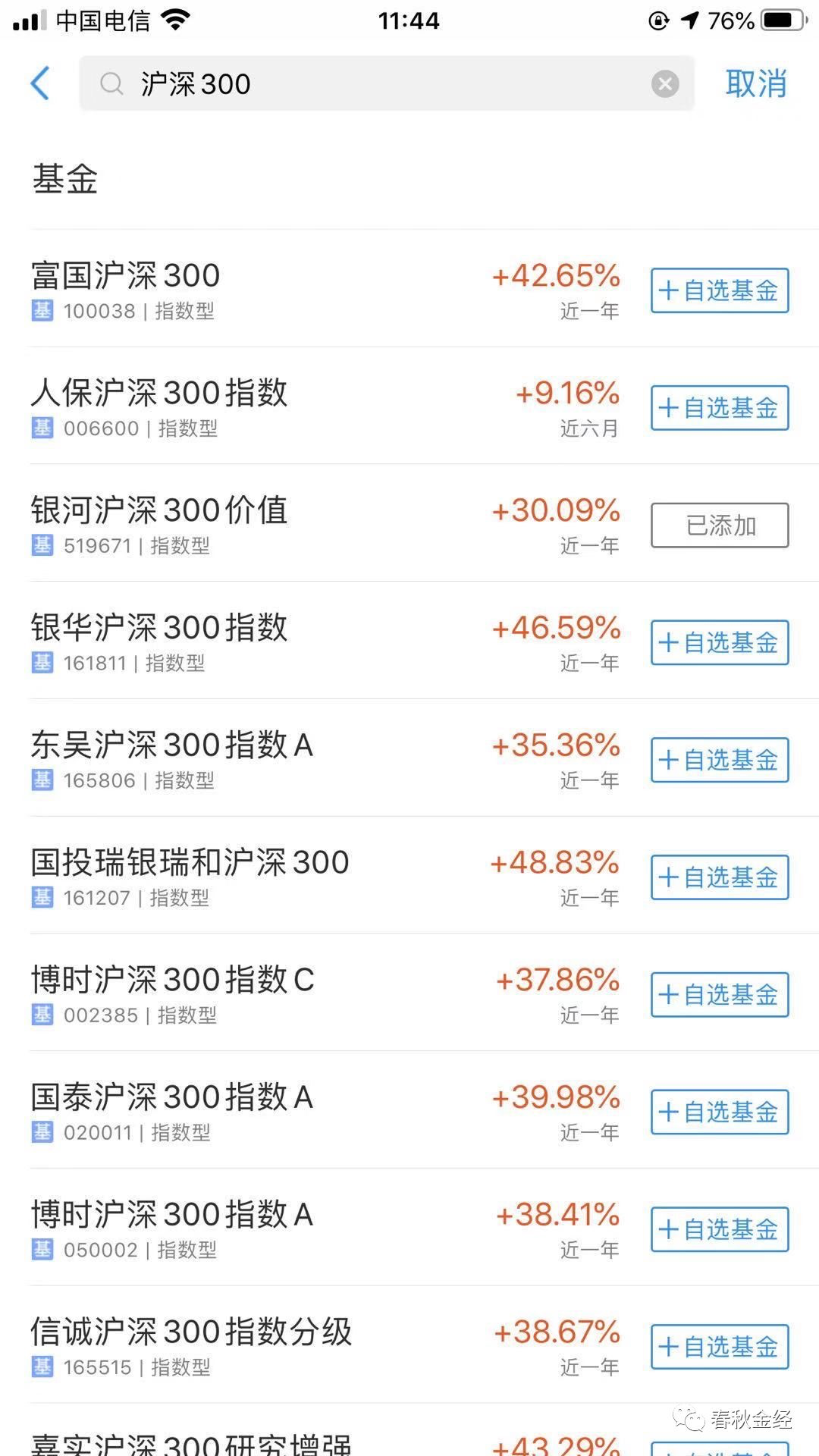 可以看到沪深300指数基金有很多种,有300指数、300指数增强、300指数价值,有的同样名字还有A和C。300指数价值和300指数增强长期来看都可以跑赢沪深300,是从沪深300指数成分股里面又选出了一些股票。指数A和指数C的差别在于管理费和买卖手续费不同,长期定投的话买指数A。至于前面的嘉实、富国、银河、博时,则是基金公司的名字。