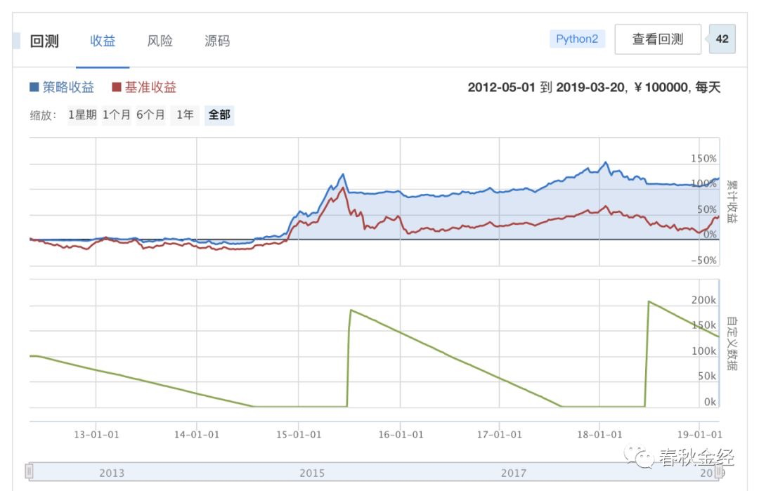 可以看到这个策略基本上两三年会遇到一次清仓的机会,年化收益10%以上,胜率100%。它的好处是坚持下来容易,操作简单,盈利逻辑清晰,不需要门槛,小白也可以上手。