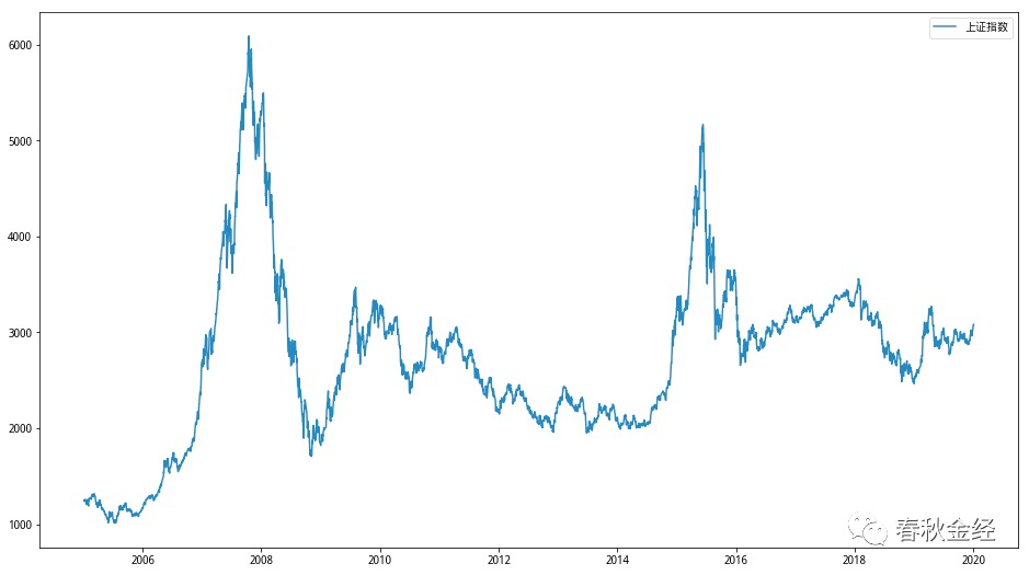 中国经济发展很快,但是股市却未能长牛,多年来都是熊长牛短。我们拉取2005年1月-2020年1月十几年间的大盘数据,绘制成下图: