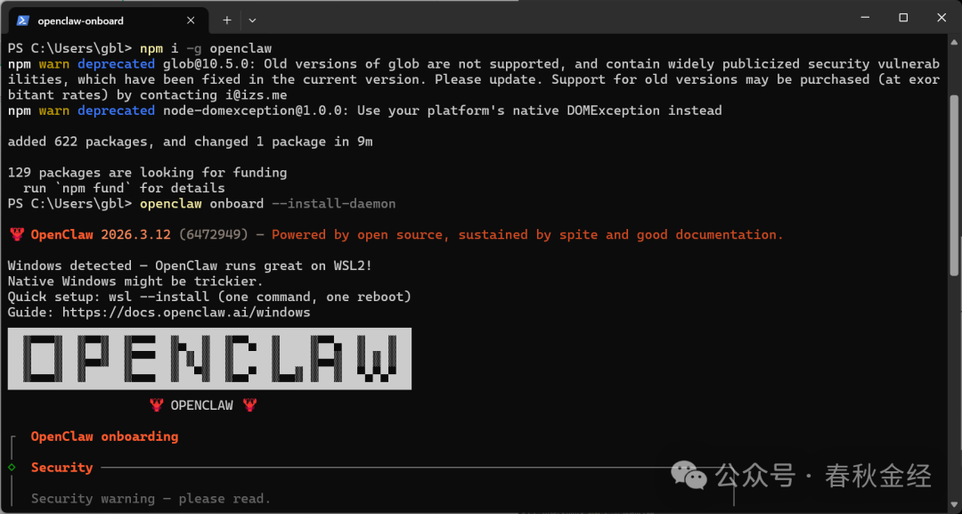npm i -g openclaw 然后回车即可安装好openclaw。