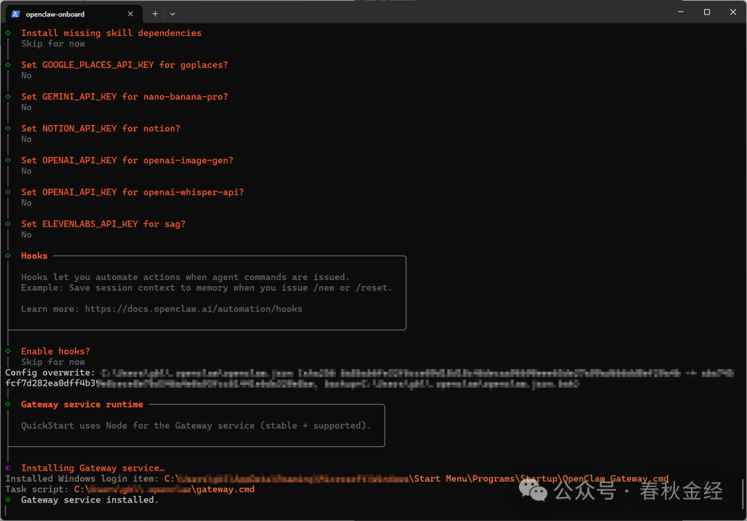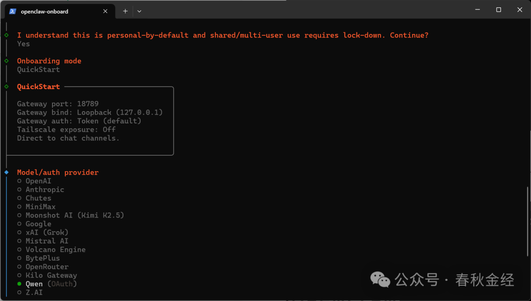 第四步Select channel (QuickStart)可以先跳过,以后可以安装qq机器人和飞书插件。