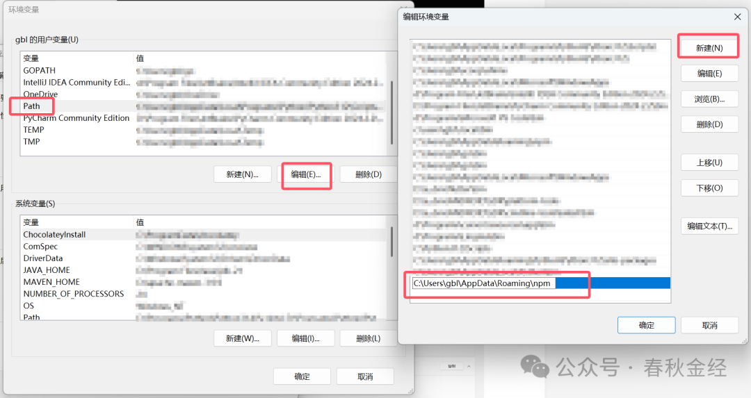 右键“我的电脑”-系统-高级系统设置-环境变量,然后找到Path点“编辑”,把npm prefix -g 获取到本地npm安装路径加入进去。